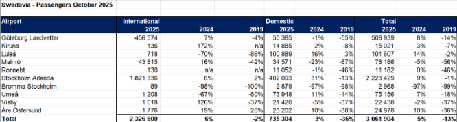 “In October, passenger numbers at Swedavia's ten airports increased by 5 per cent compared to the same month last year, with both international and domestic travel contributing to the growth. At Arlanda, passenger numbers rose by just over 9 per cent, and the airport saw more international travellers than in the corresponding month before the pandemic in 2019. This is a sign of strength, which is positive for the development of aviation and Sweden’s connectivity,” says Jonas Abrahamsson, Swedavia's CEO.