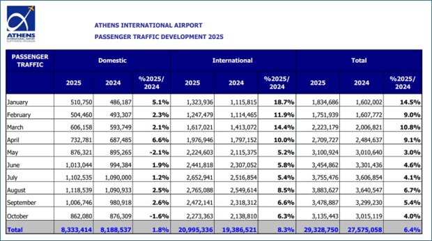 Passenger traffic at Athens International Airport increased by 4.0% in October 2025, vs. 2024 with International traffic the main contributor. International traffic in October 2025 increased by 6.3% compared to the same month in 2024. Share of International traffic increased by 1 percentage point reaching 72% from 71% in October 2024.