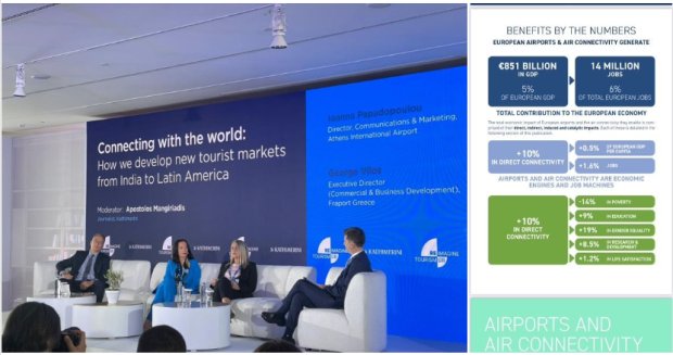The main topic of the panel was to highlight the strong momentum for the development of new markets for Athens and Greece in total, as well as the benefits of air-connectivity. Successful stories for Athens Long Haul developments include the growth in the US connectivity, having already increased from 46 weekly departures and 4 destinations in 2019 to 103 weekly frequencies and 9 destinations in 2025 (peak Summer period). Equally, for the Chinese market, connectivity has increased from 3 weekly frequencies and 1 destination in 2019 to 12 weekly frequencies and 3 destinations in 2025.