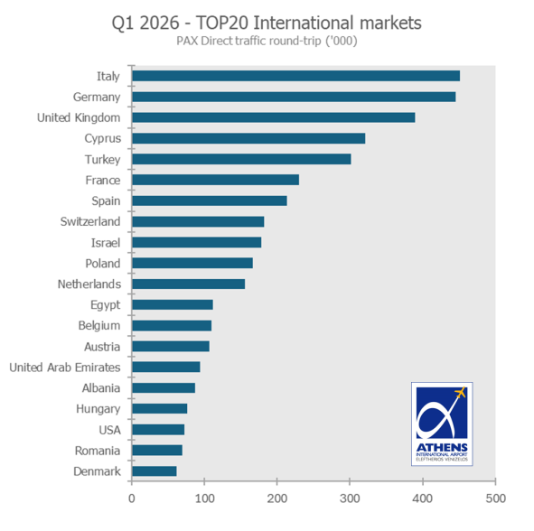 The TOP20 International markets, accounted for 62% of Total passenger traffic at Athens during Q1 2026.