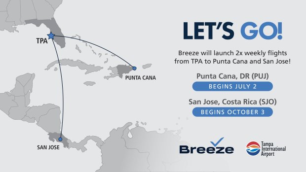 For the first time in over 25 years, an airline will offer nonstop service from Tampa International Airport to San Jose, Costa Rica. Breeze also will launch their first flights from TPA to Punta Cana, Dominican Republic.