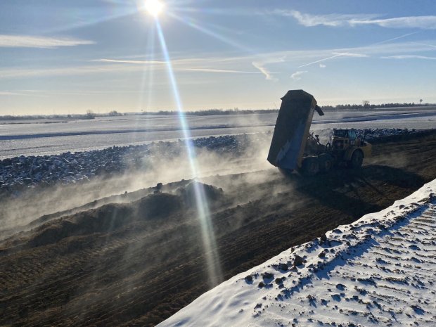 Approximately a dozen large off-road trucks, including Caterpillar 745 articulated trucks (with tires as tall as an average person), along with excavators, bulldozers, rollers, and other equipment – roughly 20 pieces in total – operate at any given time. Around 20 operators work the day shifts and a slightly smaller number work overnight shifts. During a few dangerously cold stretches this winter, work has been temporarily halted.
