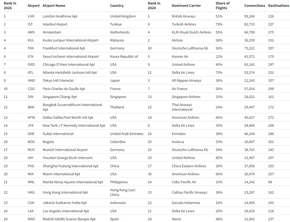Tokyo Haneda dropped down in this year's rankings, from 3rd in 2024 to 9th in 2025, reflecting a 10% decline in connections.