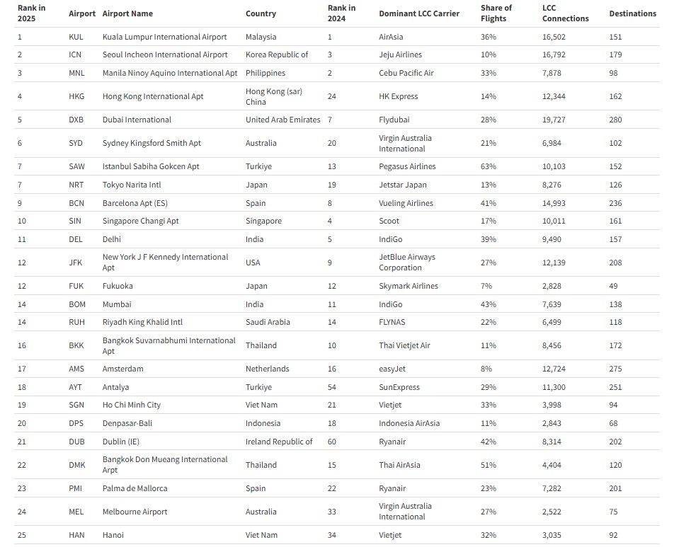 Turning now to the Low Cost Carrier (LCC) list, Kuala Lumpur again figures prominently, and actually tops the 2025 list, mostly as a result of AirAsia's operations there at what its CEO once described as a 'Taj Mahal'.