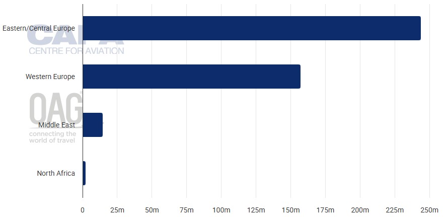 According to data from CAPA - Centre for Aviation/OAG for the week of 22-Sep-2025, its capacity is dominated by Europe, which accounts for 96.0% of Aegean's international ASKs (58.4% in Eastern/Central Europe and 37.6% in Western Europe).