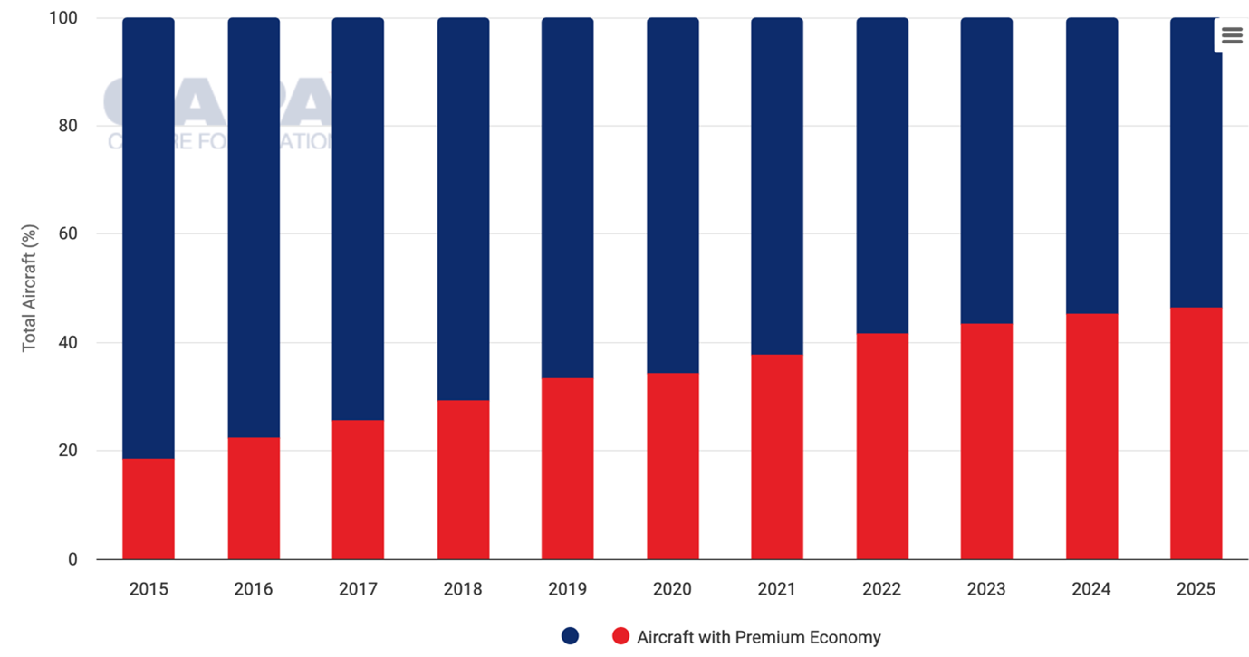 Over the past ten years of all passenger widebodies in service, the share of aircraft with premium economy installed has more than doubled, from less than 20% to approximately 45%.