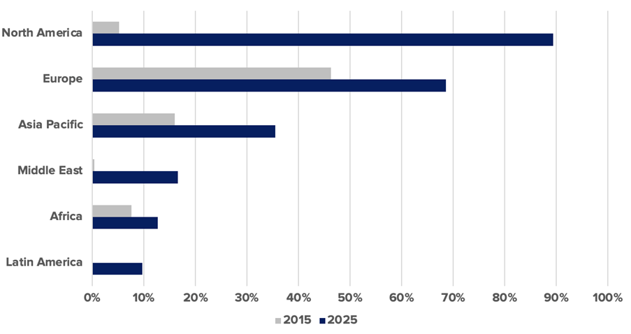 Share of passenger widebodies in service with premium economy, by region, as of Oct-2025 vs Oct-2015