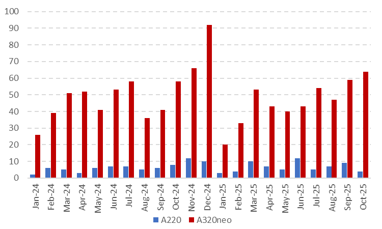 Airbus monthly narrowbody deliveries (Jan-2024 to Oct-2025)