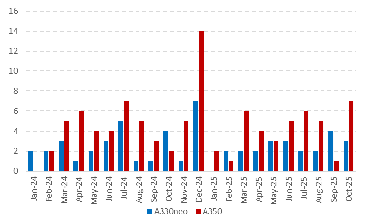 Airbus monthly widebody deliveries (Jan-24 to Oct-25)