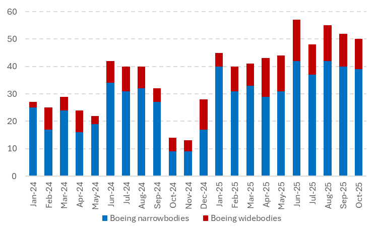 Boeing aircraft deliveries (Jan-2024 to Oct-2025)