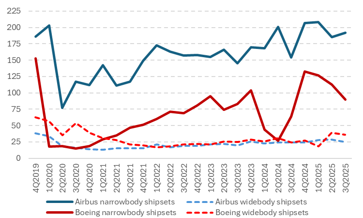 Spirit AeroSystems: quarterly aircraft shipset deliveries (1Q2019 to 3Q2025)