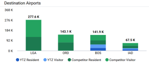The latest Catchment Analyzer data shows demand of more than 630,000 one way passengers from Billy Bishop Airport's catchment to these destinations, however the current limited service drives 88% of demand to competing airports (primarily Toronto Pearson International Airport, which captures 81% of total catchment demand).