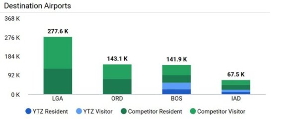 The latest Catchment Analyzer data shows demand of more than 630,000 one way passengers from Billy Bishop Airport's catchment to these destinations, however the current limited service drives 88% of demand to competing airports (primarily Toronto Pearson International Airport, which captures 81% of total catchment demand).
