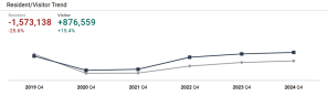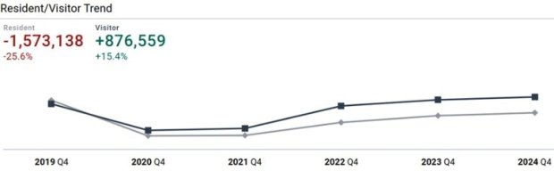 Gold Coast Airport's catchment data tells a fascinating story. Overall traffic within the airport's catchment remained 5.9% below 2019 levels as of 4Q2024, however inbound visitor journeys surged by almost 877,000 additional one way passengers (+15.4%), while outbound resident traffic dropped by 1.57 million one way passengers (-25.6%).
