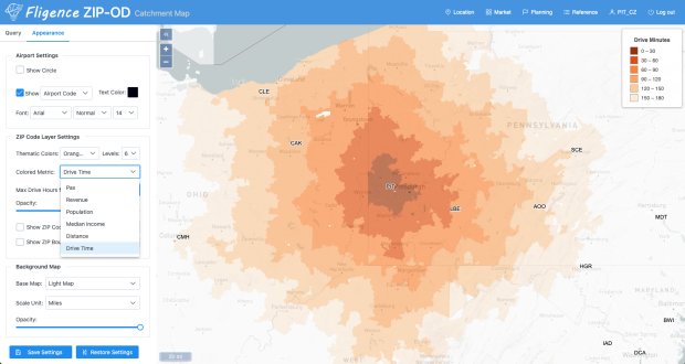 Fligence ZIP-OD now includes expanded Choropleth maps that display multiple metrics essential for ASD decision-making, including: